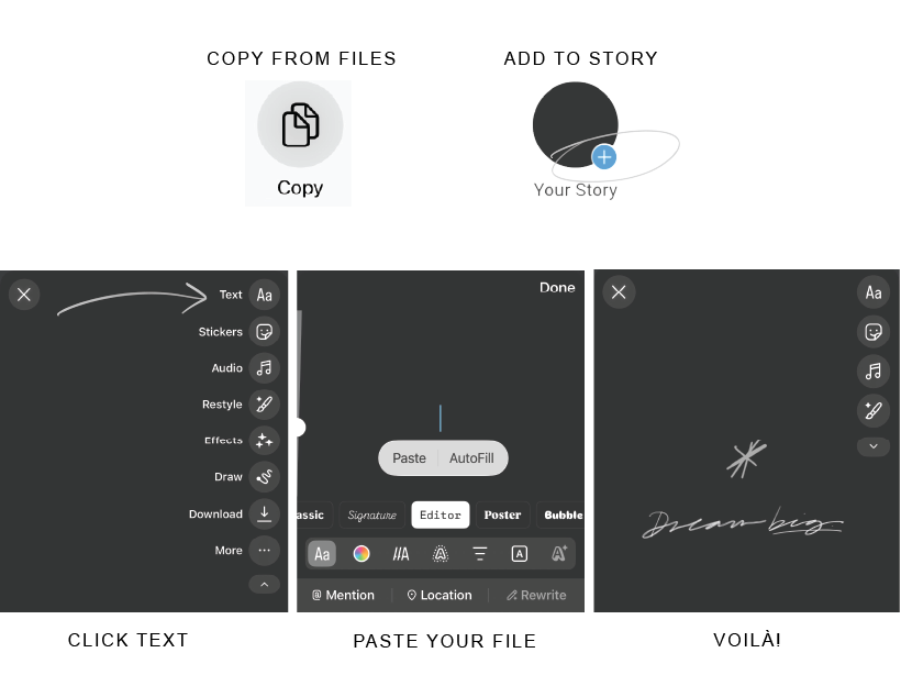 1 — Purchase2 — Check your email3— Download the file4 — Save to your camera roll5 — Copy from camera roll6 — In Instagram Stories select “text” option and pasteThe Etsy Shop.